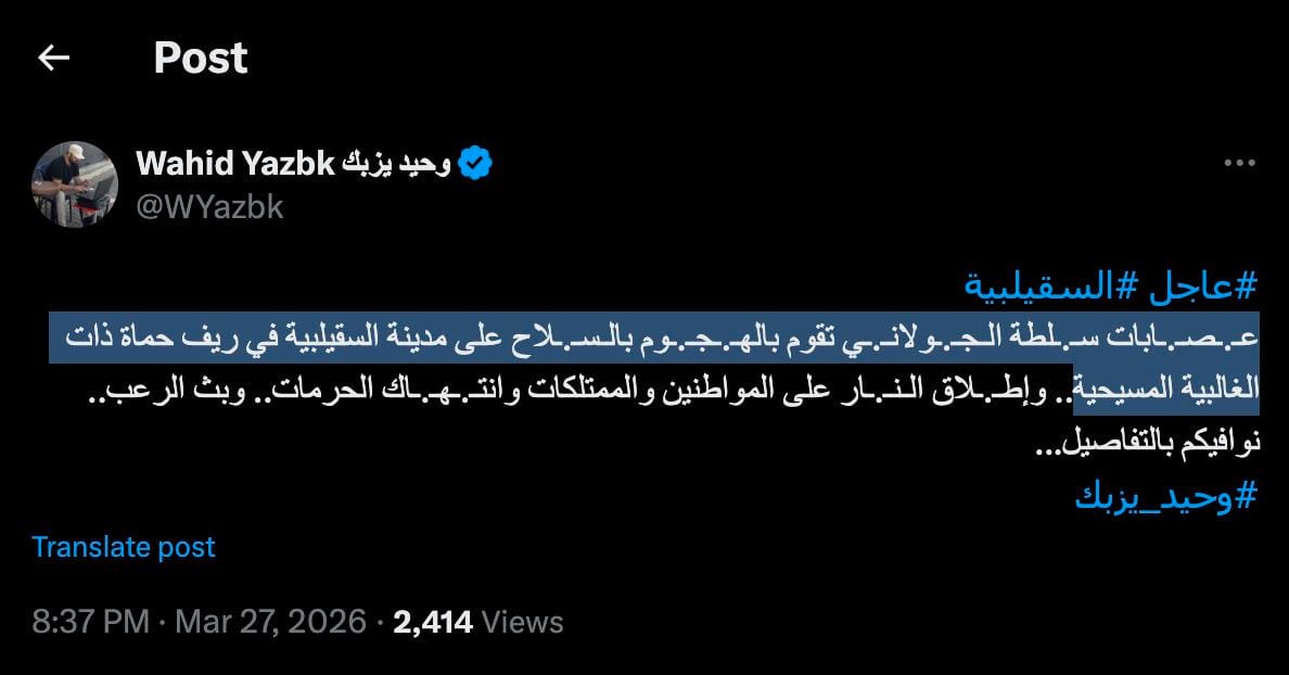 صورة 1: تغريدة للإعلامي المقرب من النظام السابق وحيد يزبك تحمل تضخيمًا لأحداث مدينة السقيلبية | المصدر: موقع X