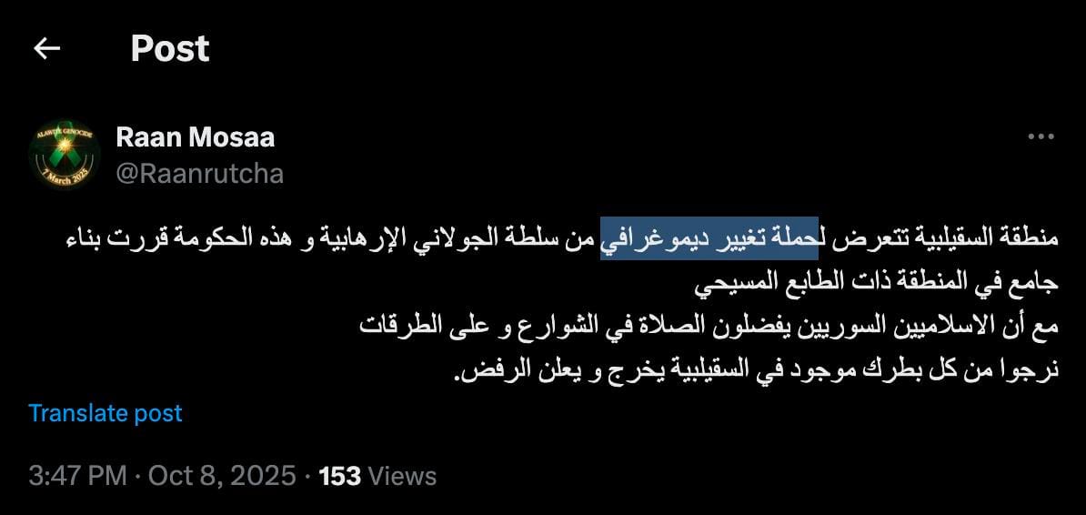 صورة 2: تغريدة مضللة تتحدث عن تغيير ديموغرافي في مدينة السقيلبية | المصدر: موقع X