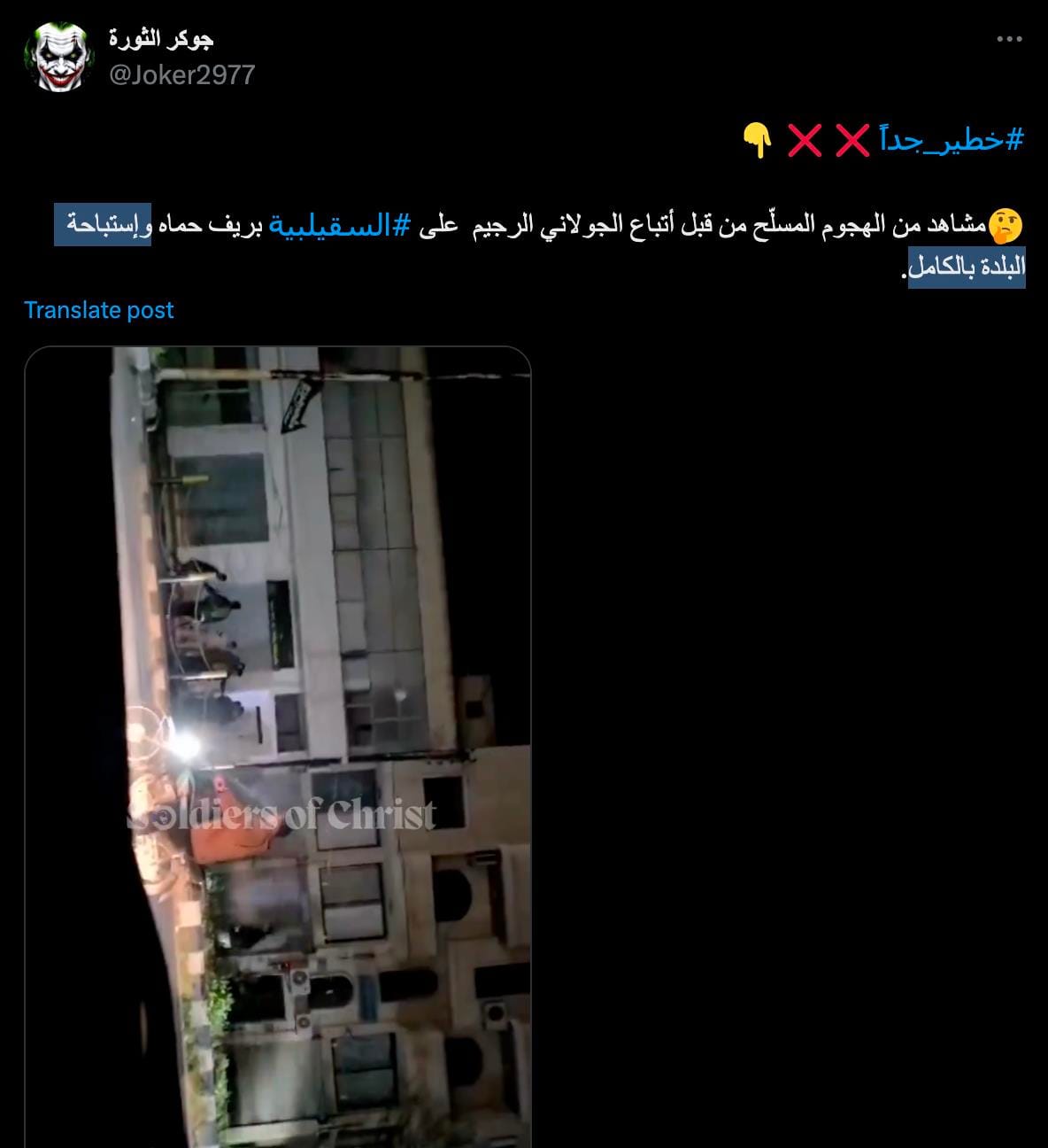 صورة 3: تغريدة مضللة تتحدث عن استباحة كاملة لمدينة السقيلبية | المصدر: موقع X