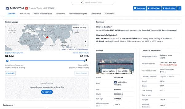 صورة 1: بيانات ناقلة النفط MKD Vyom | المصدر: Marine Traffic4