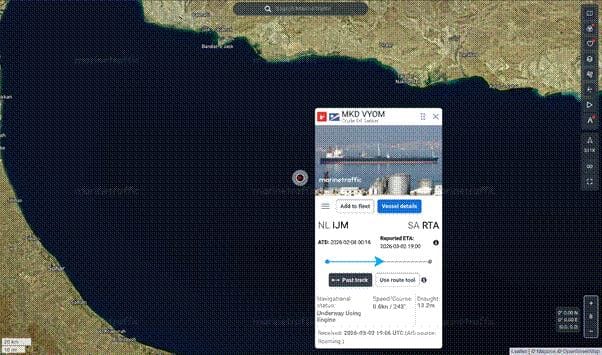 في الأول من آذار/ مارس استُهدفت2 ناقلة النفط MKD Vyom في مضيق هرمز، حيث وقع تحديدًا على بعد حوالي 50–52 ميلًا بحريًّا قبالة سواحل مدينة مسقط العُمانية من الجهة الشمالية الغربية لميناء السلطان قابوس. وفي اليوم نفسه، تُظهر بيانات موقع تتبّع السفن Marine Traffic3 أن السفينة باتت خارج الخدمة، وهي ناقلة نفط خام، تحمل رقم التسجيل 9284386 وتُبحر تحت علم جزر المارشال، كما يبلغ طولها الإجمالي 228.6 مترًا وعرضها 32.57 مترًا، وتبلغ حمولتها حوالي 59,463 طن متري.
