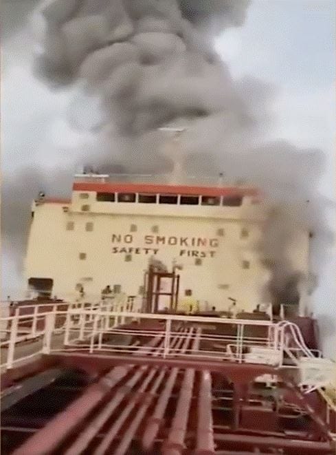 وأظهر مقطع فيديو لناقلة النفط، احتراقها وتصاعد الدخان منها، وتحديدًا من غرفة المحرّك وذلك بعد استهدافها في صباح اليوم نفسه.