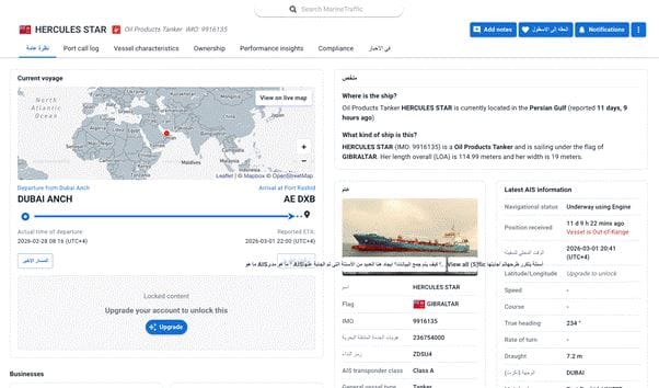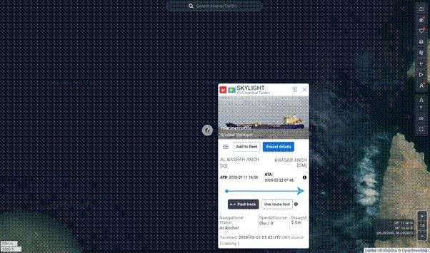 أظهرت بيانات حركة السفينة، أنّها أبحرت في 8 شباط/ فبراير 2026 من مدينة آيمادون (IJmuiden) في إقليم شمال هولندا نحو ميناء رأس التنورة في السعودية، كما تعرّضت للإصابة في هذا الموقع تحديدًا: 25.95, 57.10
