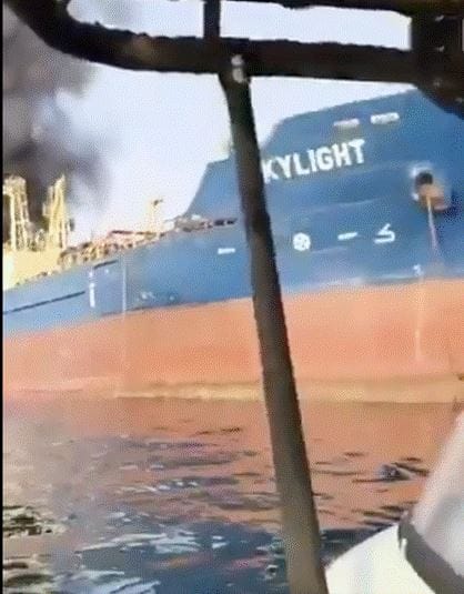 وأظهر مقطع فيديو، لحظة استهداف السفينة واشتعال النار فيها، ما أدّى إلى عطبٍ في السفينة نتج عنه تسرّبٌ نفطي.