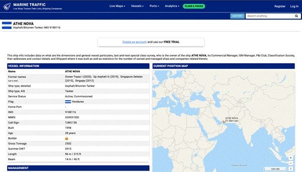 صورة 15: بيانات ناقلة النفط Athe Nova | المصدر: Marine Traffic