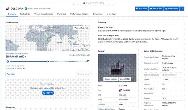 صورة 17: بيانات سفينة Gold Oak | المصدر: Marine Traffic