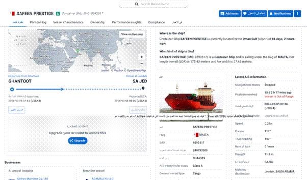 صورة 22: بيانات سفينة Safeen Prestige | المصدر: Marine Traffic