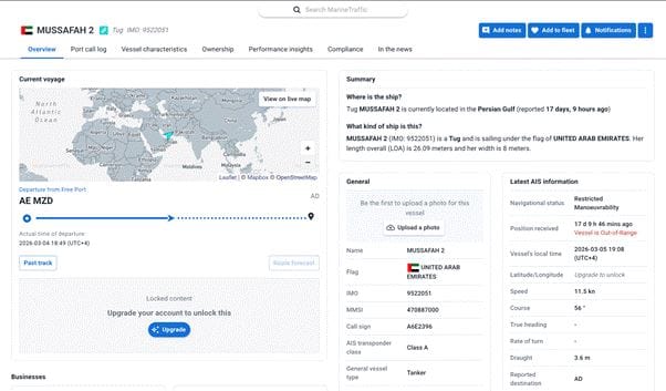 The UAE-flagged tug Mussafah 2 was struck by two missiles while attempting to assist the abandoned container ship Safeen Prestige in the Strait of Hormuz.